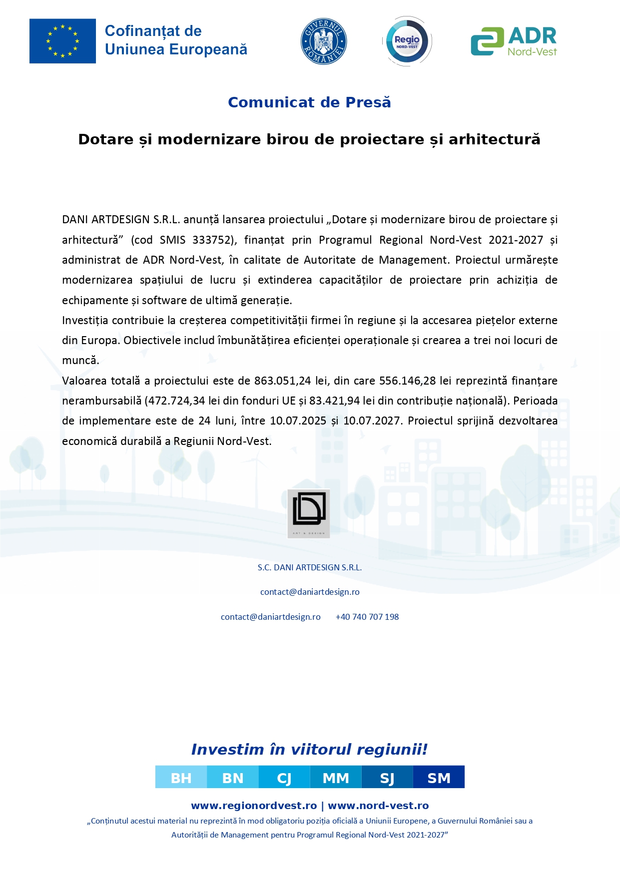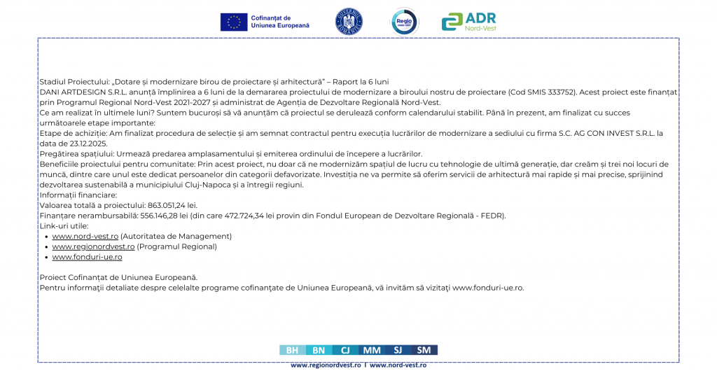 DANI ARTDESIGN S.R.L. implementează proiectul cu titlul „Dotare și modernizare birou de proiectare și arhitectură”, cod SMIS 333752, finanțat prin Programul Regional Nord-Vest 2021-2027. Proiectul se derulează în municipiul Cluj-Napoca, județul Cluj, pe o perioadă de 24 de luni, începând cu data de 10.07.2025 și având ca termen de finalizare data de 09.07.2027.